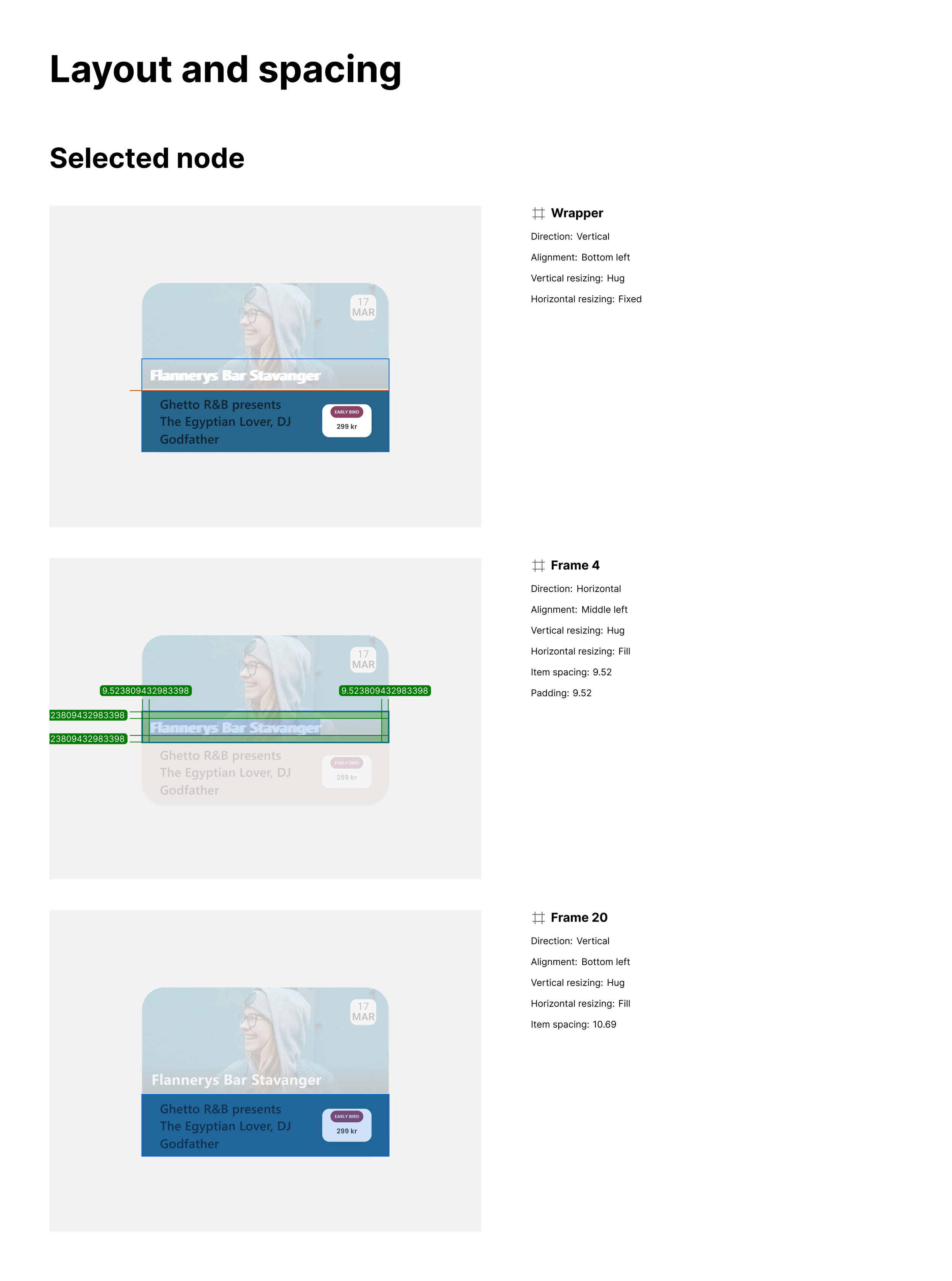 Auto Layout setup and spacing details for the card component — designed for flexibility and responsive behavior.